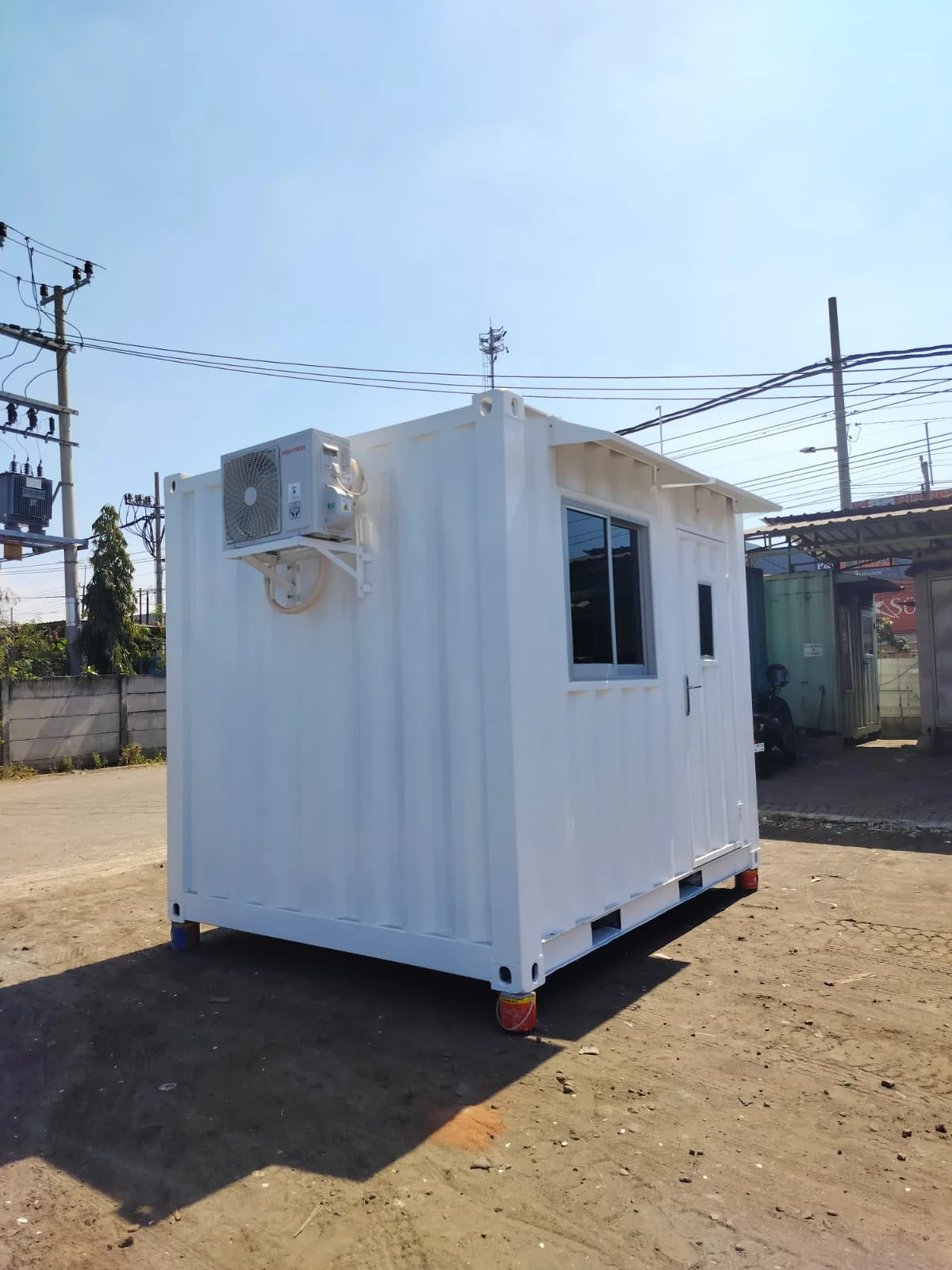 Jual container office 10 feet siap pakai. Solusi ruangan kantor di proyek atau on site yang efisien untuk kebutuhan kantor sementara, pos keamanan, atau ruang kontrol di area proyek dengan lahan terbatas. Dibuat dari container modifikasi bekas yang telah direkondisi secara total.