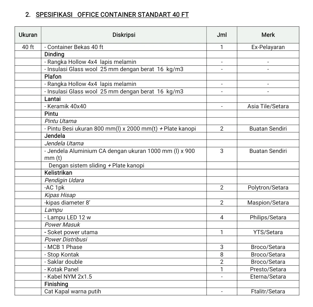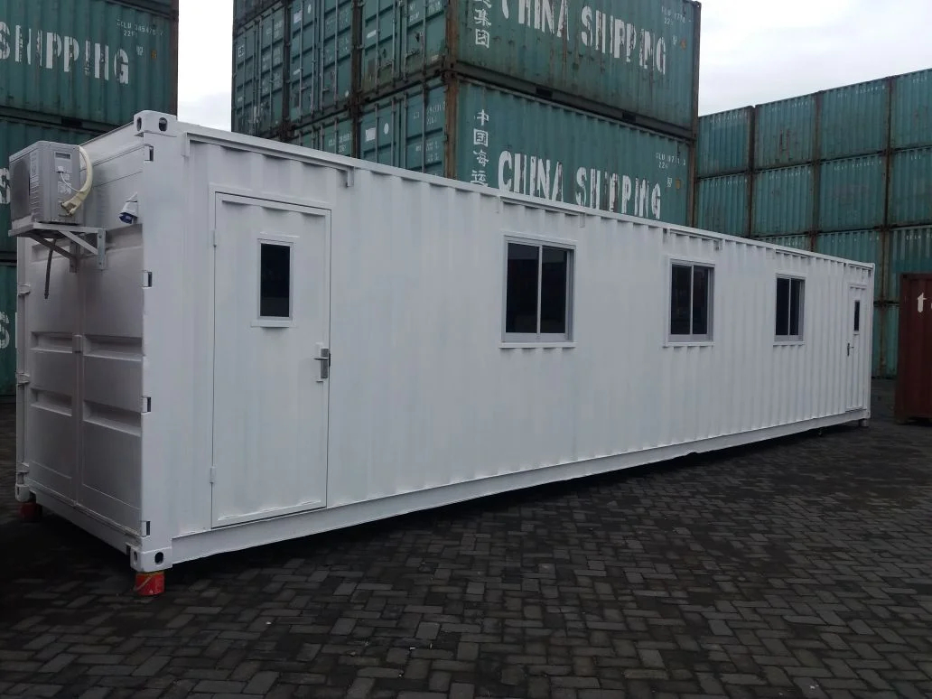 Untuk kebutuhan ruangan kantor yang lebih besar, kami jual container office 40 feet. Produk ini dirancang untuk menampung tim yang lebih besar, berfungsi sebagai ruang serbaguna, atau kantor pusat di lokasi proyek skala besar. Kustomisasi adalah keunggulan utama dari container modifikasi ini.