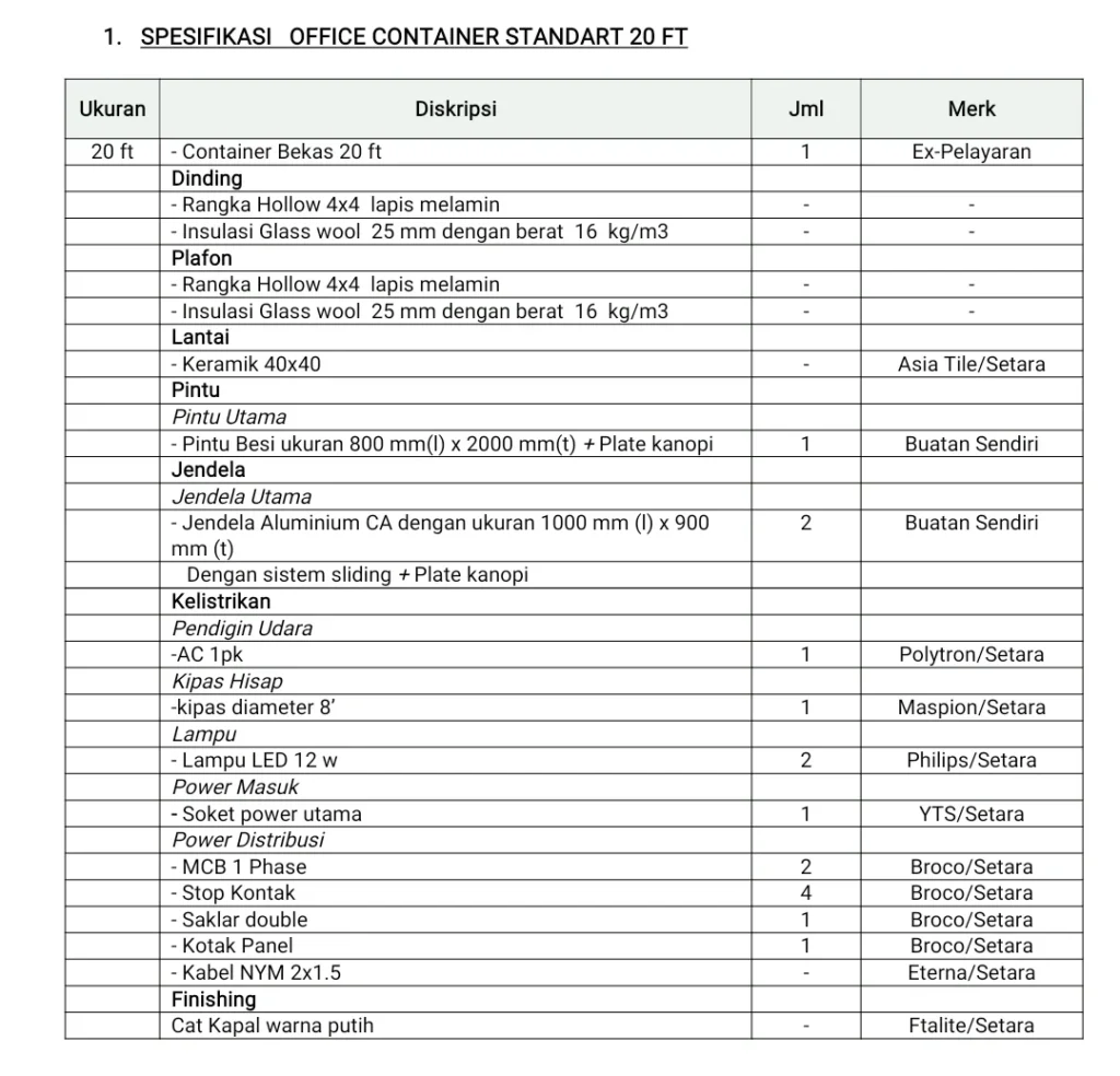 - Container 20 Feet: Wajib menggunakan AC minimal 1 PK.